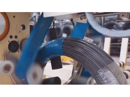 Линия выполняет упаковку, взешивание и маркировку бухт проволоки и узких рулонов в автоматическом режиме. Вертикальная структура значительно сокращает занимаемое место, что делает линию идеальным выбором для производственных объектов с ограниченным пространством.