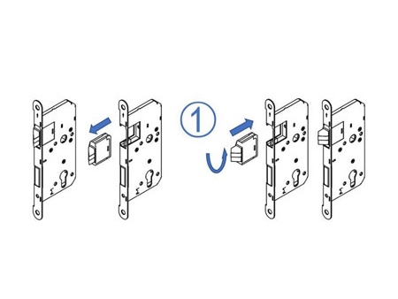 Убедитесь, что уклон защелки направлен в сторону закрытия двери (если направление уклона неправильное, открепите защелку от корпуса замка и поверните ее на 180 °. Затем вставьте защелку обратно и закрепите ее). Установите лицевую планку, а затем затяните винты. - Открытие двери вовнутрь: толкать снаружи и тянуть изнутри. После установки внешней и внутренней розетки ручек, установите нажимные ручки (отверстие для винтов должно быть направлено вверх), а затем затяните винты.