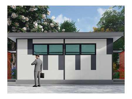 Сборный общественный туалет с плоской крышей S010-004, разделенный на мужской и женский туалеты, занимает площадь 37 квадратных метров. Сборный туалет с белой стеной, современной плоской крышей, стеклянным навесом и оранжевым ограждением обеспечивает комфортную среду для пользователей.
