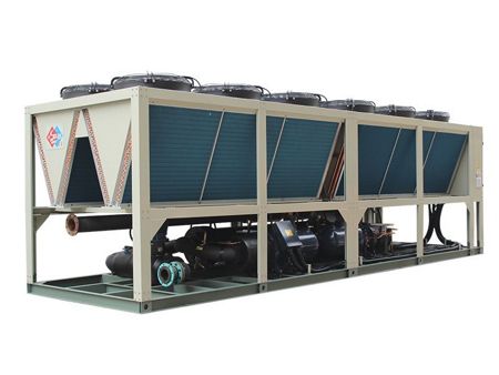 Винтовой чиллер с воздушным охлаждением оснащен винтовым компрессором, который при сжатии обеспечивает достижение хладагентом высокого давления и температуры. После этого хладагент поступает в испаритель и поглощает тепло от материала, снова превращаясь в газ при более низком давлении и температуре. Затем вновь образовавшийся газ поступает обратно в компрессор, таким образом, цикл начинается заново. Чиллер такого типа использует собственный конденсатор с воздушным охлаждением для отвода тепла в воздух.