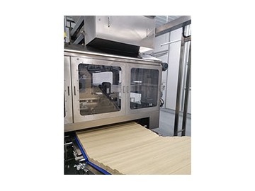 После прокатки через 3 ролика ламинатора тесто разрезается на 8-16 кусков и затем подается на формовочные ролики. Обработка теста ламинатором листов придает бисквитам идеальный внешний вид и хрустящую текстуру. В сочетании с распылителем муки данный ламинатор для резки листов можно использовать для производства крекеров или другой выпечки.