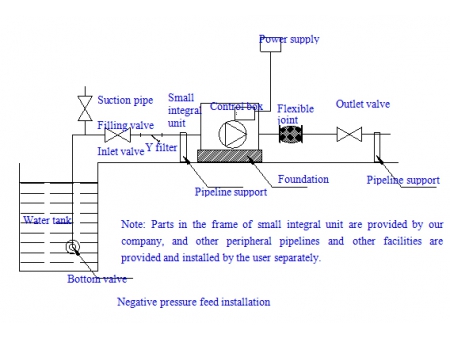 - • При установке оборудования заказчик предоставляет впускной и выпускной клапаны, гибкие соединения, подходящие к данному частотно-управляемому насосу, удобные для обслуживания и не допускающие шума от проходящей через трубопровод воды.