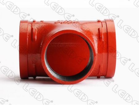 Переходной тройник с пазами предназначен для соединения труб при уменьшении (или увеличении) размера трубы. Это переходник, в котором трубы разных размеров могут быть соединены вместе с помощью одного тройника. После нарезания канавок на концы трубы натягивается резиновая прокладка, подходящая для данной конкретной системы. Затем сегменты муфты накладываются на прокладку, затягиваются гайки и болты, в результате получается надежное и герметичное соединение труб. Плоская металлическая шайба внутри муфты предотвращает выдвижение трубы меньшего размера в большую. Расчет расхода муфты аналогичен расчету расхода концентрических редукторов.