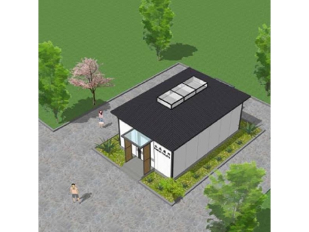 Модуль площадью 41.52 кв.м. включая стеклянный козырек 4.32 кв.м., разделен на женскую и мужскую уборные комнаты. Удобные и практичные туалеты нашего производства гарантируют комфорт жителям, а белые стены, покатая крыша и деревянный заборчик модуля прекрасно впишутся в ландшафт.