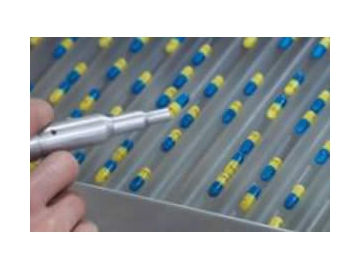 Инспекционная машина для таблеток/капсул выполнена из нержавеющей стали, оснащена устройством подачи, позволяющим равномерно расположить капсулы и таблетки на выводном валике. После снятие электростатического электричества и инспекции в ручную, некондиционные изделия отсеиваются при помощи пневматического устройства.