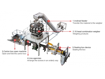Линия по упаковке изделий в картонные коробки MK-LS-AC предназначена для упаковки изделий в коробки, автоматически выполняет дозирование, вскрытие короба, заполнение и спайку упаковки. Линия оснащена комбинационным весовым дозатором, благодаря чему снижаются производственные расходы и возможна упаковка большого количества и тяжелых металлоизделий, включая гайки, болты и другие. Направляющие встроены в оборудование для обеспечения точного позиционирования коробок и аккуратного заполнения крепежными изделиями.