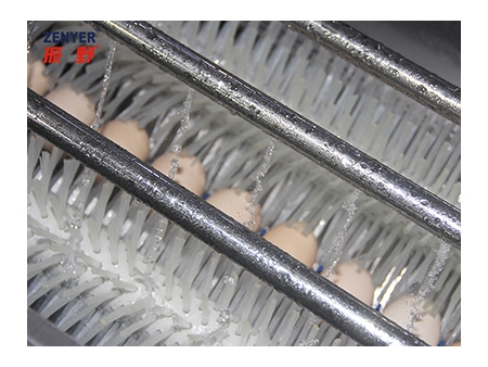 Яйца тщательно очищаются щетками, для распыления используется теплая вода (водонагреватель не поставляется с машиной, ее предоставляет заказчик). Оборудование оснащено модульными щетками с подвижной конструкцией, расстояние, положение и скорость которых может регулироваться.