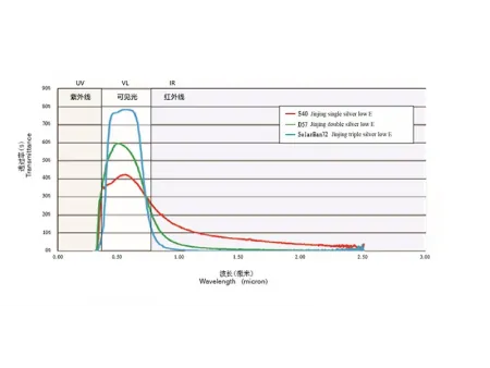 На диаграмме вы можете ясно увидеть, кривые пропускания видимого света в диапазоне 380-780 нм. Средняя вертикальная линия представляет область видимого света, а область справа представляет инфракрасную область (780-2500 нм). Поскольку большая часть тепла переносится инфракрасным излучением, область под кривой отражает солнечную энергию, передаваемую непосредственно через стекло. Часть самая крупная для однослойного низкоэмиссионного стекла с серебром, указывает на то, что трехслойное низкоэмиссионное стекло с серебром обеспечивает наименьшую теплопередачу, обеспечивая превосходные теплоизоляционные характеристики.