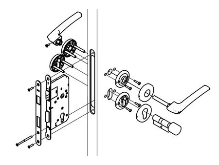 - Установите дверные накладки для цилиндрового механизма и затяните винты. Установите цилиндр замка в отверстие внутренней дверной накладки и пропустите его через корпус замка и внешнюю накладку. Затем закрепите цилиндровый механизм к армированному корпусу замка винтами.