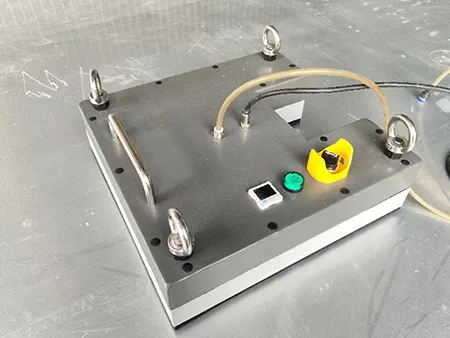 Вакуумный подъемник состоит из всасывающего корпуса, губчатого слоя, схемы управления и пневматической системы, корпуса из листового металла и подъемного кольца. При нажатии кнопки всасывания начинает работать вакуумный генератор и в течение 1-3 секунд система достигает требуемого уровня отрицательного давления для безопасного подъема груза, о чем сигнализирует зеленый индикатор.