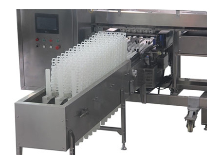 Яйца отправляются в секцию накопления и ультрафиолетовой стерилизации. Система УФ-стерилизации стерилизует яичную скорлупу для обеспечения максимальной стерильности обработанных яиц. Яйца автоматически поворачиваются головкой вверх. Положение с головкой вверх обеспечивает более долгий срок годности яиц.